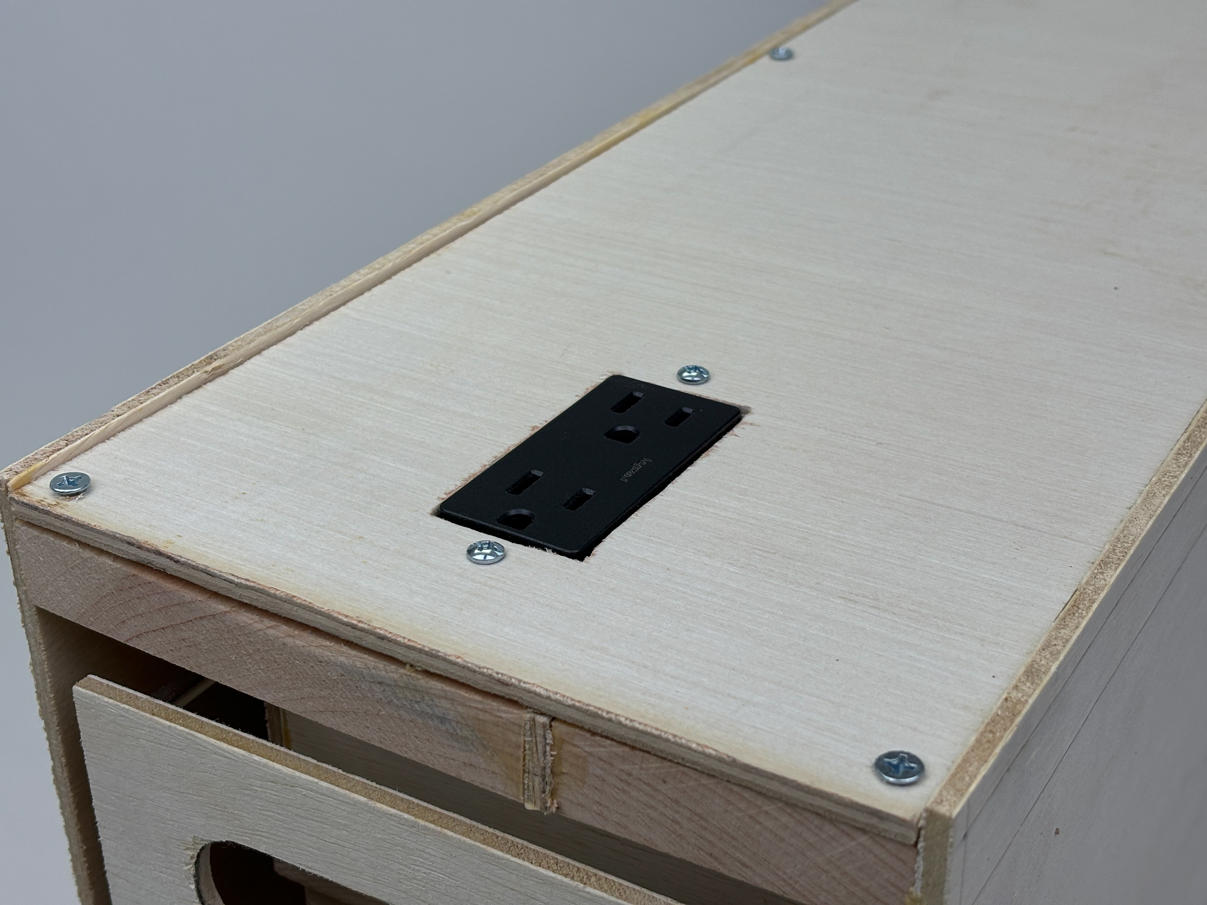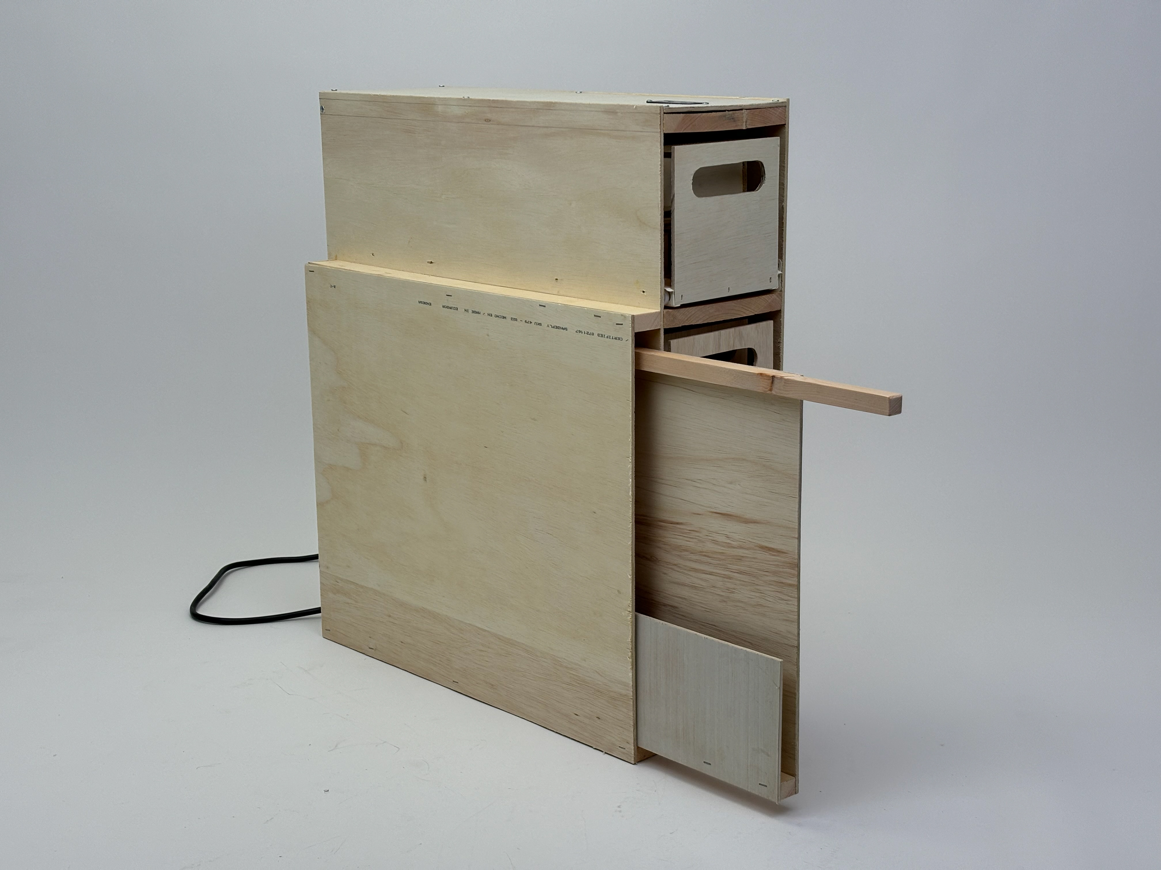 My team designed a shared storage space that is not impeding in terms of space, offers storage for industrial designer supplies including paper, writing instruments, alignment tools, templates and more. Additional features include an outlet for charging, and a fold-away elevated platform for creating an expanded workspace.